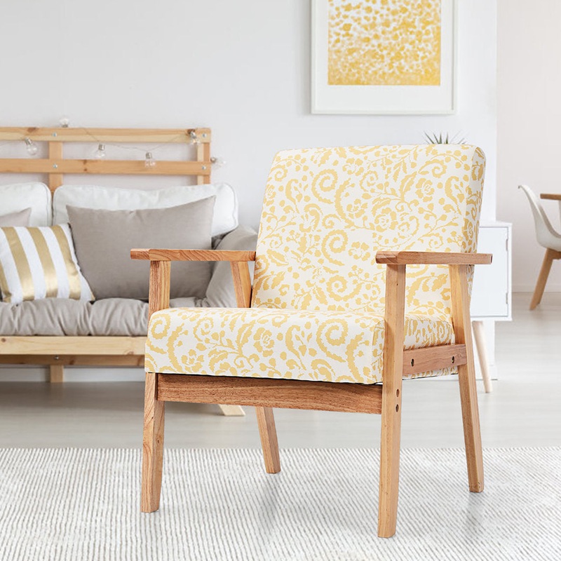 Relax in your sunroom or on your patio with this classic armchair. Crafted with a solid wood frame, this chair features foam back and seat cushions upholstered in 100% linen. Two square cushions rest on a sleek wood frame with square arms and tapered legs for a traditional look with modern polish. We love that this chair has a 22.5” width that makes it great for pairing with a patio table or breakfast table and it supports up to 265 lbs. Best of all, the seat cushion is removable, which makes cleaning easy. George Oliver Fabric: Yellow Floral 100% Linen