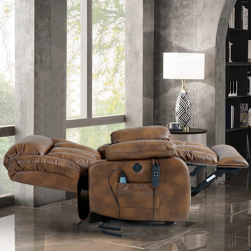 Power Lift Recliner Chair: We insist on choosing environmentally friendly timber with higher production costs. Our powerful and UL-approved silent lift motor, has better performance, the more quiet operation, longer service lifespan. We will provide maximum comfort and stability and are committed to protecting the health of the elderly who choose our electric lift chair. Suitable for the living room, bedroom even your office. Quality Fabric & Overstuffed Pad: Our lift recliners are made of high-quality leather which is soft and wear-resistant. The backrest, seat cushion, and armrests are filled with a high-density sponge, which provides you ultimate comfort and support, just like the whole body is wrapped up in a chair. The leather is soft to the touch, and durable, which is functional for optimal comfort, and perfect for reading, sleeping, or napping. Heating & Massage Function: This recliner chair comes with 8 powerful vibration motors, 4 custom zone settings, and 5 modes. In addition, there are the timing of the remote control and waist heating functions. Through vibration and heat to achieve a massage effect, making you feel relaxed. Convenient Design: With thoughtful Storage Space & USB Charging Port, you can keep remotes and other small items, and charge your Low Power devices. Our lift chair reclines up to 160 degrees and smoothly adjusts to the lift or reclining position you prefer by pressing two buttons on the armrest, which is easy to operate for people of all ages. Weight Capacity – 330 lbs, Measure 36″ W x 32″D x 42″H.Easy Assembly & Customer ServiceThe recliner comes in 1 box and we provide detailed instructions with numbered steps. Super easy to assemble and usually only takes 10-15 minutes to finish the installation, no tools are required. We also provide 1-year technical support for the lift motor and steel frame. If any shipping is damaged when it arrives or is defective during usage, please feel free to contact us, we will provide the best after-sales service. Latitude Run Body Fabric: Light Brown Genuine Leather