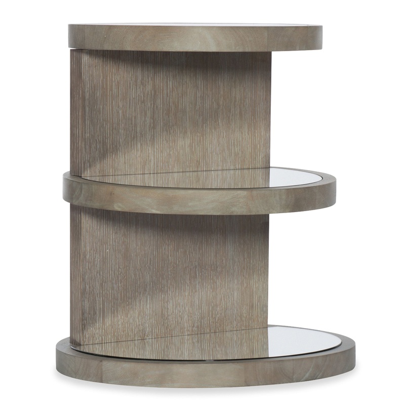 Symmetry and style come together in the Affinity Round Table, featuring three shelves with glass inserts in tapering sizes and a tactile greige sand-blasted finish on Quartered Oak Veneers. The top shelf is 18 wide, the middle shelf is 20 inches wide, and the lower shelf is 22 inches wide.