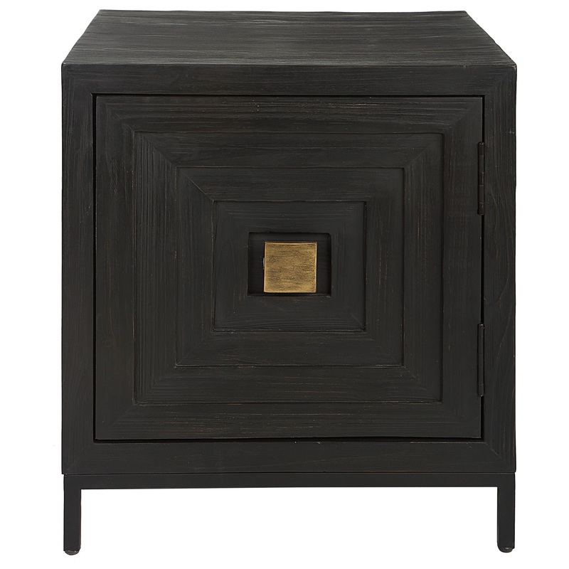 A Contemporary Geometric Accent Cabinet, Constructed From Deeply Grained Fir Wood Finished In A Dark Ebony Stain And Accented With Brushed Brass Hardware. Has One Fixed Interior Shelf.
