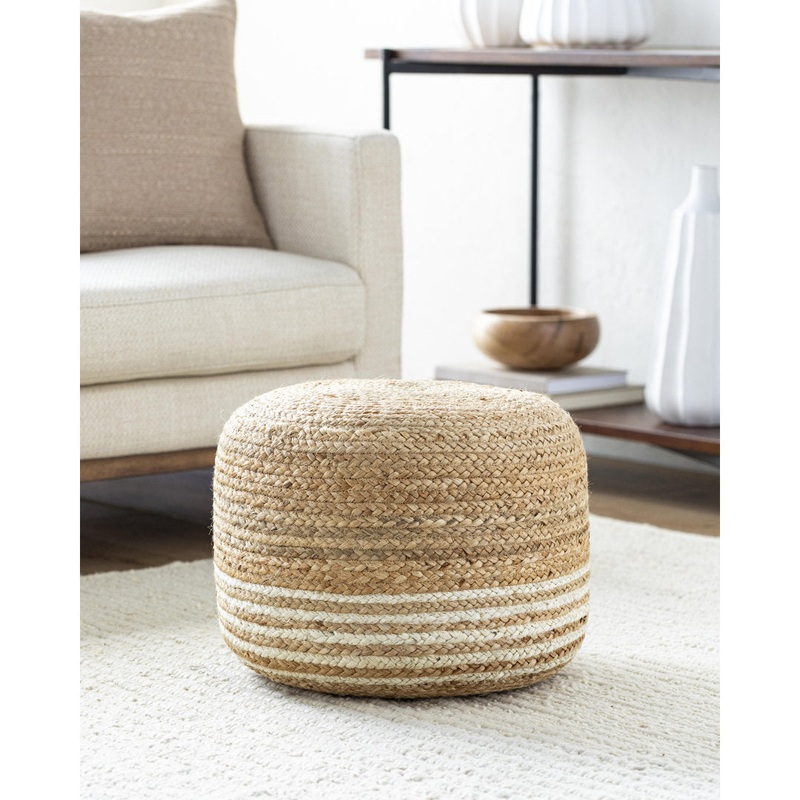 This texture-rich pouf lends natural vibes and a multi-functional design to your living space. It’s crafted from jute and features a charming round silhouette filled with polybeads to help give it a puck-like shape. The neutral hues and classic striped motif complement coastal and cottage living rooms and reading nooks alike. Plus, this pouf measures 18″ wide, so you can use it as a spare seat, a place to kick up your feet, or even as a coffee table stand-in for homes with a smaller square footage. Birch Lane