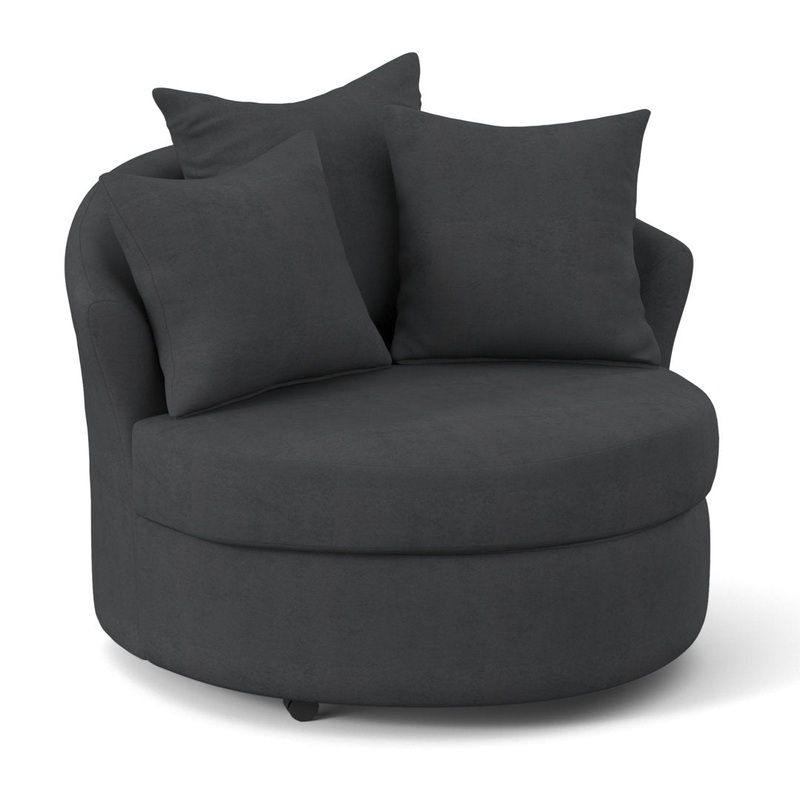 This barrel chair brings a round and inviting silhouette to your living space. Made in the USA with a wood frame, it rests on low-profile feet with a black finish. Boasting a classic barrel shape, it features a rounded back that curves around its sides to act as arms. This chair is upholstered in the fabric type and hue of your choice, blending in seamlessly with your surrounding design scheme. It features removable cushions for easy cleaning, and it comes with three included toss pillows for a curated look. Andover Mills Fabric: Bulldozer Slate