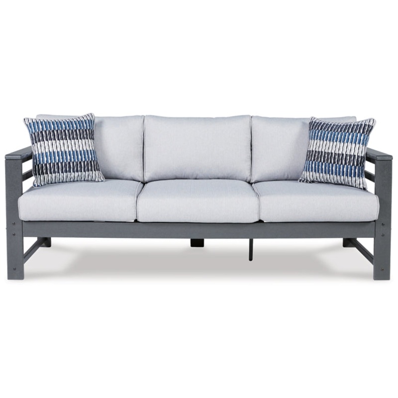Indulgently comfortable furniture shouldn’t be limited to inside spaces. Create your own outdoor oasis with this cushioned sofa. A study in form and function, the trend-right charcoal gray frame is crafted from MEGA TUFF HDPE material for durability and weather resistance. Cushions wrapped in high-performing Nuvella fabric are comfortable and carefree.