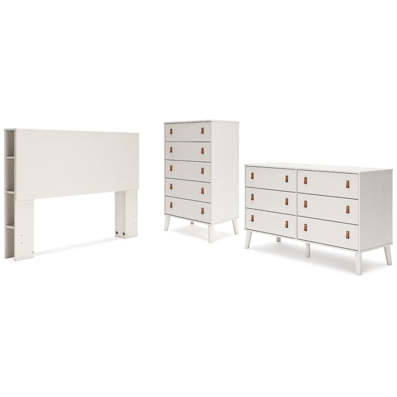 Dare to take minimalism to the max. This bedroom package has an air of sleek simplicity thanks to its white painted finish with subtle replicated wood grain. Two sets of faux leather pulls in light brown and gray allow you to customize the drawers to suit your space.