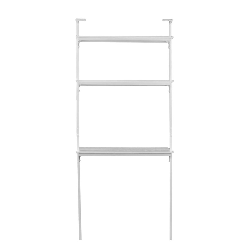 Turn any empty wall into a streamlined home office with this ladder desk. Crafted of iron in a matte gray finish, this unit features an open, ladder-style frame. Made from engineered wood in a handsome woodgrain stain, a wide desktop shelf is perfectly sized for holding your laptop, while two upper hutch shelves are great for displaying books and accessories. It comes with tip-prevention hardware for added security.
