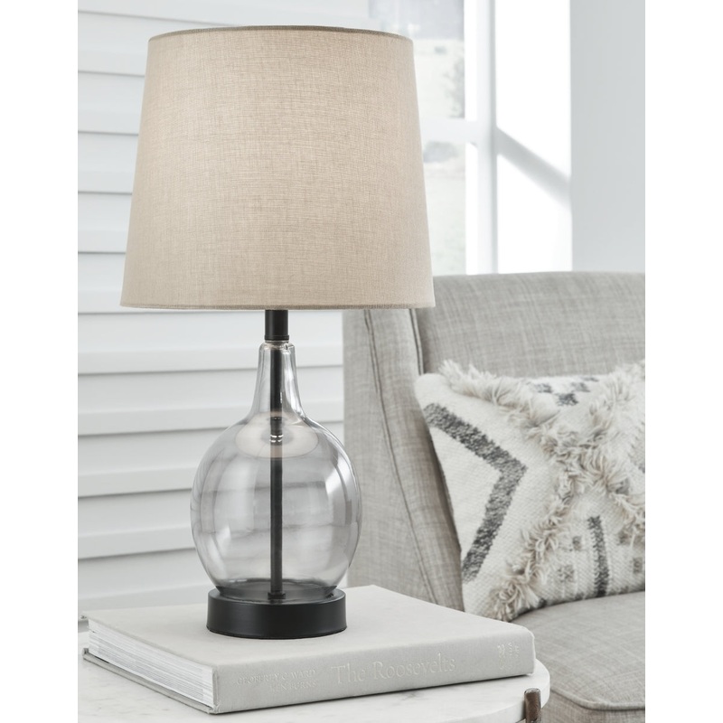 This glass table lamp package is the perfect combination of form and function, providing lighting and chic style to any interior. The curvaceous transparent gray lamp is crafted for modern flair and topped with a fabric shade.