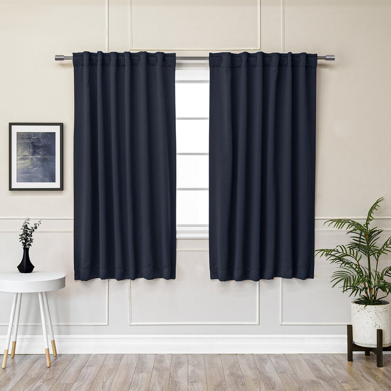 This pair of blackout curtain panels offers a practical solution for those who love a cozy, darkened space. Made from polyester, it comes in an array of solid hue options to suit your space’s style and color scheme. With thermal insulation and noise cancellation, they’re just right for blocking out the sun and keeping your room quiet, whether enjoying a lazy Sunday morning or an afternoon map. A rod pocket header makes this duo easy to hang on a compatible curtain rod (sold separately). Plus, these curtains are machine-washable and iron-safe, so keeping them looking fresh is a breeze. Ebern Designs Curtain Color: Navy, Size per Panel: 52″ W x 72″ L