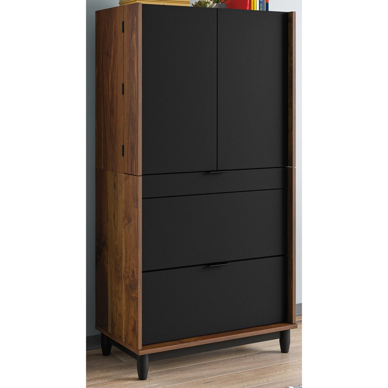 Who doesn’t love a multifunctional cabinet? This armoire desk from the Banujan collection is the organizer’s dream. The hidden area behind the swing-out doors reveals various cubbyhole storage options for sticky notes, pens, and books. The upper doors have a metal retaining rod on the lower shelves to keep office supplies from falling out. The left door of this armoire desk features a cork bulletin board, and the right door features two adjustable shelves that feature a retaining lip. Wow! This armoire desk is customizable and includes infinite amounts of storage capabilities. The flip-down molding reveals a slide-out keyboard/mouse shelf for easy storage. The lower barrister door of this wood computer cabinet flips up and slides back into the cabinet. A lower file drawer with full extension slides holds letter or legal-size hanging files to keep documents close at hand. If that’s not enough, a cord management system allows for reduced cord clutter. Finished in grand walnut with black accents, this armoire desk with storage cabinet is just what your home office is missing. Wade Logan