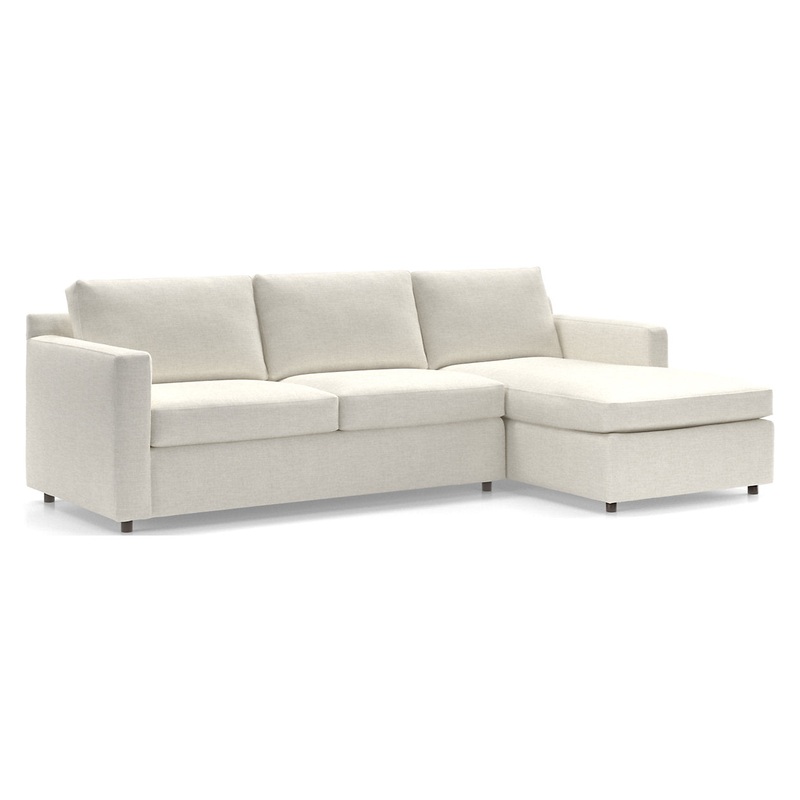 Barrett makes modern sectional seating affordable and carefree. Upright yet comfortable, this versatile sectional looks casual and clean in a contemporary fabric that feels great to the touch and is so durable you don’t need to worry about spills or pets. The two-piece sectional is designed to always look its best, even in high-traffic family rooms. The Barrett II 2-Piece Right Arm Chaise Sectional is a Crate & Barrel exclusive.Left Arm Apartment Sofa, Right Arm Chaise 101.5″Wx61.5″Dx35.5″HFrames are benchmade with certified sustainable engineered hardwood that’s kiln-dried to prevent warpingDurable, independently tested, 7.5-gauge sinuous spring foundation designed to support cushions and eliminate saggingHigh-resilience polyfoam seat cushions wrapped in soy-based foam and encased in synthetic tickingFiber back cushions encased in synthetic tickingTopstitch detailingLeft Arm Chaise, Armless Loveseat, Corner, Right Arm Apartment SofaSee product label or call customer service for additional details on product content