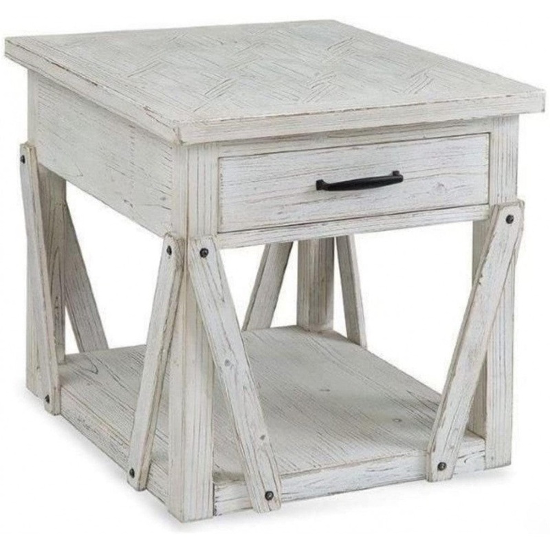 AttributesFinishColorMaterialWhiteWhiteUndeclaredDescriptionTradewinds styling. White-washed pine with inlaid geometric design on tops. End table has a drawer for storageDimensionsDepthWidthHeight24 IN24 IN27 INFeaturesFinish: Whitewashed Pine Size: 24x24x