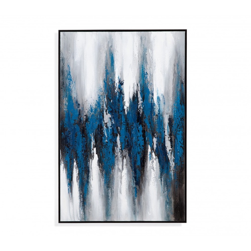Severn is an abstract acrylic hand painted canvas framed with a simple black molding. D-ring or sawtooth picture hanging hardware included.