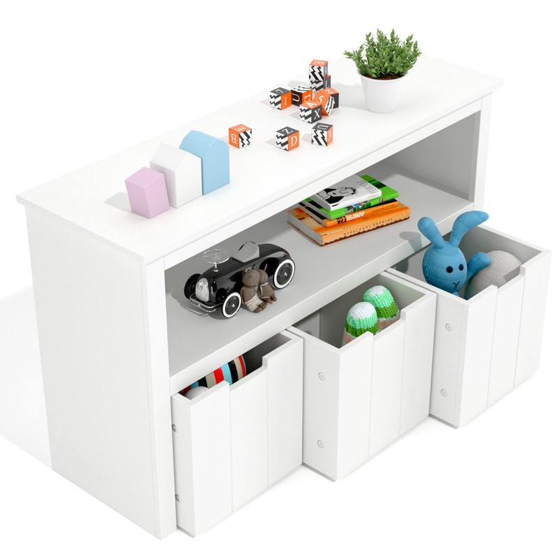This bookcase is a bold, clean-lined modern design that features 3 removable bins with cutout handles, making it easy to access whatever's in it. Removable and detachable, these compartments are an ideal way to tuck away toys, books, and more and keep your