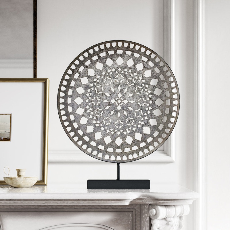 You might not know that you needed a large medallion sculpture in your home but, you do! This sculpture design is made from metal in a disc shape and showcases laser cutouts for a geometric look. Its finished in a distressed gray hue for an antique-inspired look. The medallion stands atop a metal rectangular metal base, which is padded on the bottom to prevent your surfaces from scratching and scuffing. Now you just have to decide whether it looks better on your console table or your mantle! Hand-curated by Kelly Clarkson. Kelly Clarkson Home