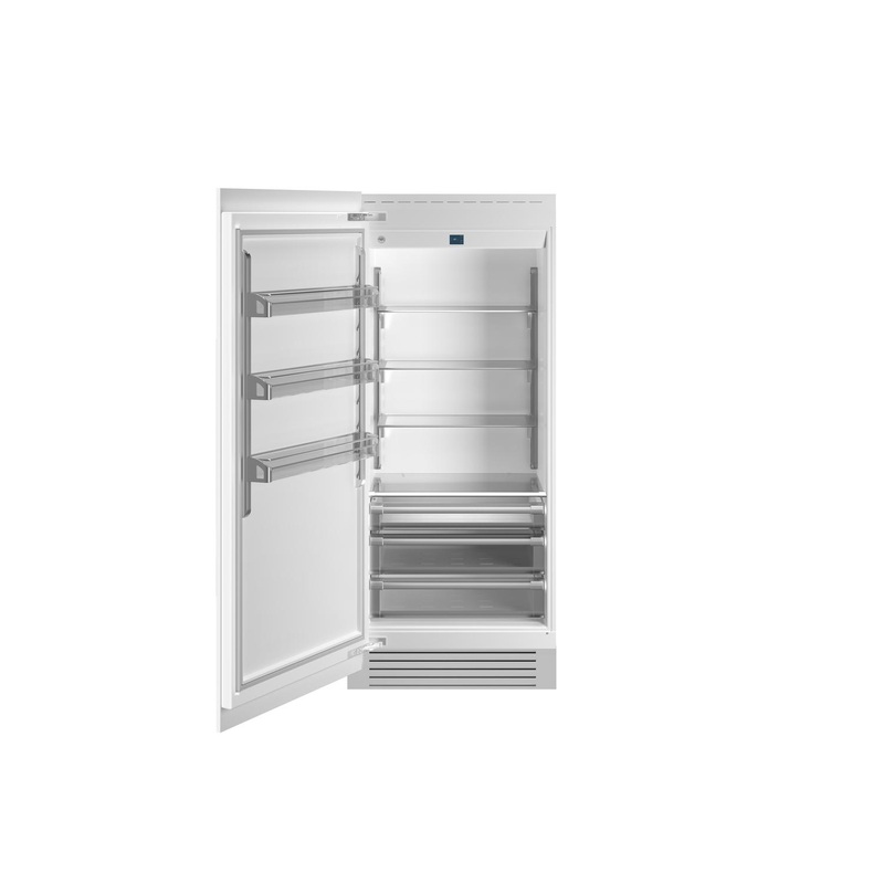 36″ Built-in Refrigerator column – Panel Ready – Left hingeThese premium built-in column refrigerators are masterpieces of Bertazzoni design and technology. Their stylish panel ready front reflect close attention to detail and high-quality materials, inside and out. Aluminium and glass surfaces make it easier to maintain hygiene throughout. The side-mounted evaporator design offers category-leading depth and storage capacity. Top and lateral LED lighting gives you perfect all-round visibility. Easy to use, the touch-control user interface offers precision temperature control to extend food preservation. A variable speed compressor ensures accurate temperature control and energy efficiency. Efficiency is key: lateral airflow creates a cold air curtain to maintain a consistent temperature even when door is opened frequently. Rapid cooling to optimize the temperature when large amounts of food are loaded. Proprietary lift & swing hinges allow for flush installation with minimal clearance from surrounding cabinet panels. This allows for elegant configurations of refrigerator, freezer and wine cellar in any desired width. All three columns work in harmony with handles and finishes available for every Series.