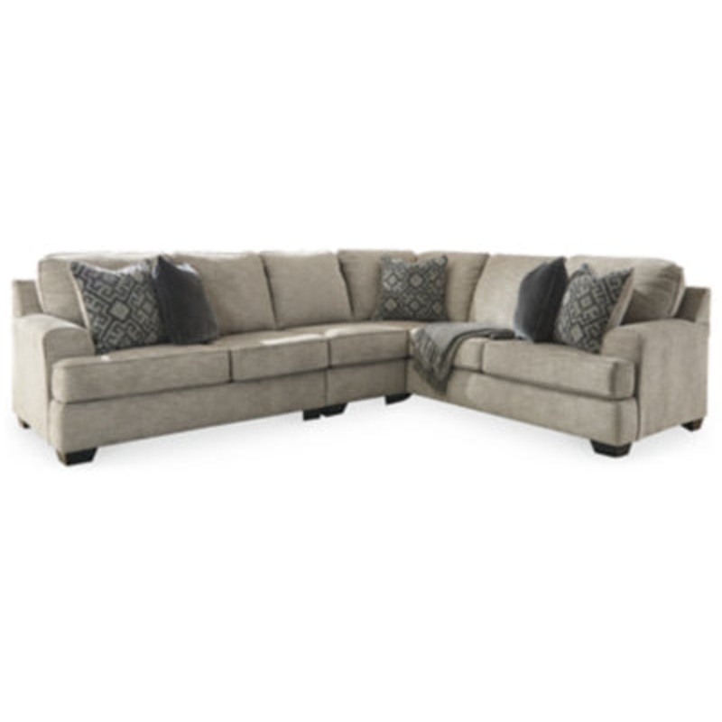 Whether your vision is clean and contemporary or cozy modern farmhouse, this sectional in a stone-tone neutral upholstery has the corner on style. Merging ultimate comfort with striking good looks, this chic sectional includes five coordinating accent pillows for that much more feel-good allure.