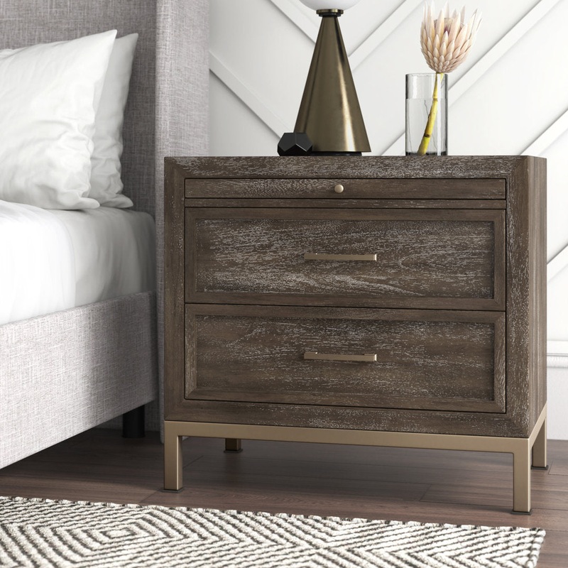 A modern take on traditional styling, this nightstand has clean lines and an elegant mix of materials. It’s made from engineered wood. It’s made from engineered wood in a wire-brushed gray finish for an element of rustic design. Two drawers offer plenty of space for out-of-sight storage of your nighttime essentials. Plus, there’s a convenient pullout tray that provides additional surface space when needed. The metal base has four slim legs and a champagne finish that matches the handle pulls. Mercury Row