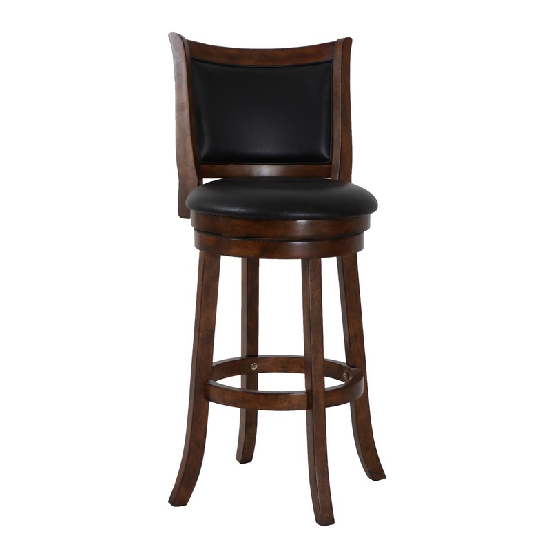 The New Classic Furniture Bristol Pub Height Swivel Bar Stool is a durable and stylish seating solution designed for comfort and convenience. Constructed from quality Rubberwood solids and manufactured wood, ensuring long-lasting strength. The circular footrest adds stability and functionality to the stool legs, while the 360-degree swivel feature allows for easy use at a kitchen island or bar. With a 29 seat height, the full foam seat cushions and backrest, upholstered in easy-care black PU fabric, provide a plush and cozy seating experience. The distinctive style is highlighted by the flared chair frame and thickly welted back cushions, evoking a classic barstool character. Assembly is a breeze with the included instructions, and a one-year warranty ensures your satisfaction. Elevate your bar or kitchen island with the Bristol Pub Height Swivel Bar Stool, where quality construction meets distinctive style.