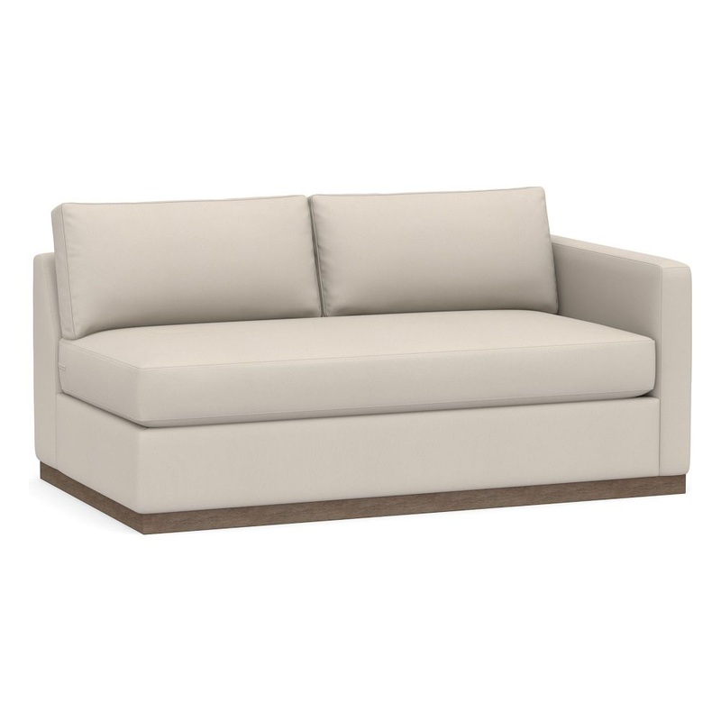 Square slim arm.Fixed wood base features a Smoked Vanilla finish.Loose cushions.Down-blend-wrapped cushions for a softer feel.Expertly crafted engineered wood frame with mortise-and-tenon joinery provides exceptional structural integrity.Kiln-dried wood helps prevent warping, splitting, cracking and developing mildew.No-sag steel sinuous springs provide cushion support.Hidden steel connectors hold modular pieces securely together.Adjustable levelers provide stability on uneven surfaces.Build-Your-Own Sectional with the following selection: Left- or Right-Arm Sofa, Left- or Right-Arm Loveseat, Left- or Right-Armchair, Left- or Right-Arm Chaise, Left- or Right-Arm Double Chaise, Left- or Right-Return Bumper, Armless Sofa, Armless Loveseat, Armless Chair, Corner, Wedge or Modular Sectional Ottoman.To ensure this piece is the right fit, see our How To Measure Guide. If you need help, our Design Crew is happy to answer any questions virtually or in your home. Book an appointment.Proudly crafted in America by our own expert furniture makers from American and imported materials.To prevent fading, keep fabric out of direct sunlight. Spot clean fabric with a damp, white cloth. Blot to remove excess water.