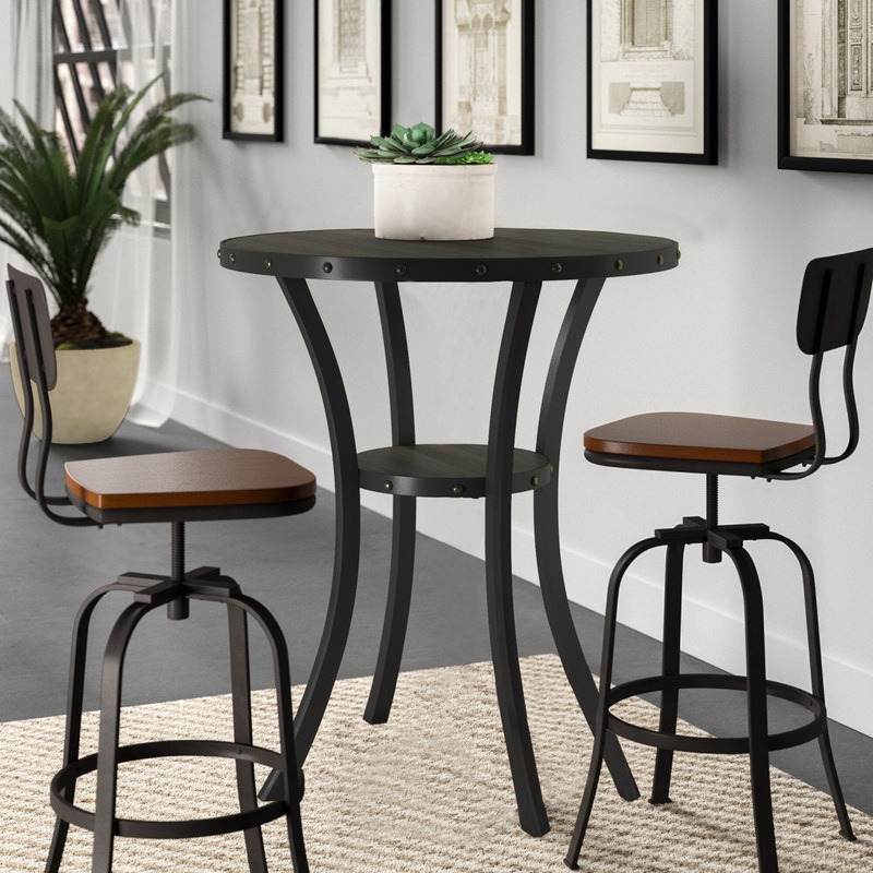 Offer your dining room the charm of modern farmhouse-inspired style with this stylish dining table. Crafted from solid wood, it features four curved supporting circular tabletop complete with decorative nailhead trim. It showcases an espresso finish and includes a lower tier for storing magazines, your favorite accent pieces, and more. It measures 42” H x 36” W x 36” D, making it ideal for romantic dinners for two and beyond. Winston Porter