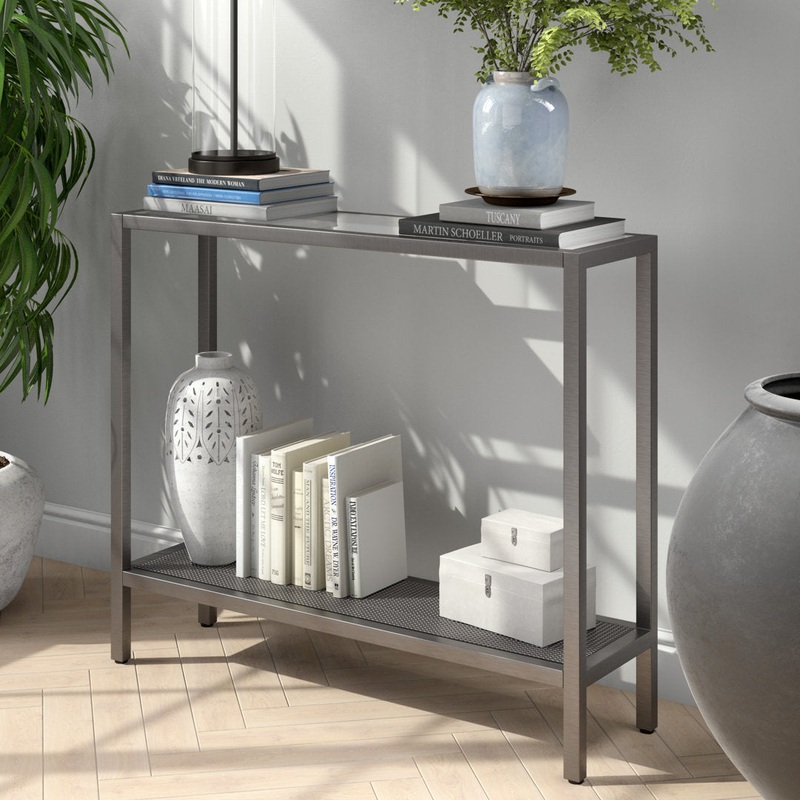 This console table streamlines your routines with extra surface space and a clean, glam look. It’s crafted from metal with a frame in an open work style and a smooth, shining solid finish. The design features two tiers of shelves the tempered glass top is great for displaying a fun table lamp or colorful vase, and the bottom metal grid shelf is ideal for stacks of to-be-read books or a set of storage baskets. We love that this versatile table works anywhere from your living room to your home office to your guest bedroom. Zipcode Design Table Base Color: Aged Steel, Size: 30″ H x 36″ W x 10″ D
