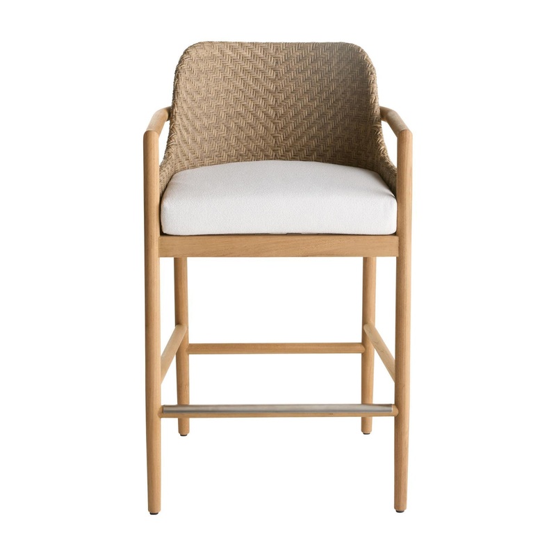 The Chilton Outdoor Stool from Arteriors is a taller reinterpretation of a Mid-Century classic, featuring sleek lines and open arms. Its sculptural dark blonde synthetic rattan back is embraced by a solid natural teak wood frame, combining organic design with durability. A supportive pearl outdoor performance boucl cushion ensures comfort and weather resistance, while stainless steel footrest caps add a refined, lasting finish.