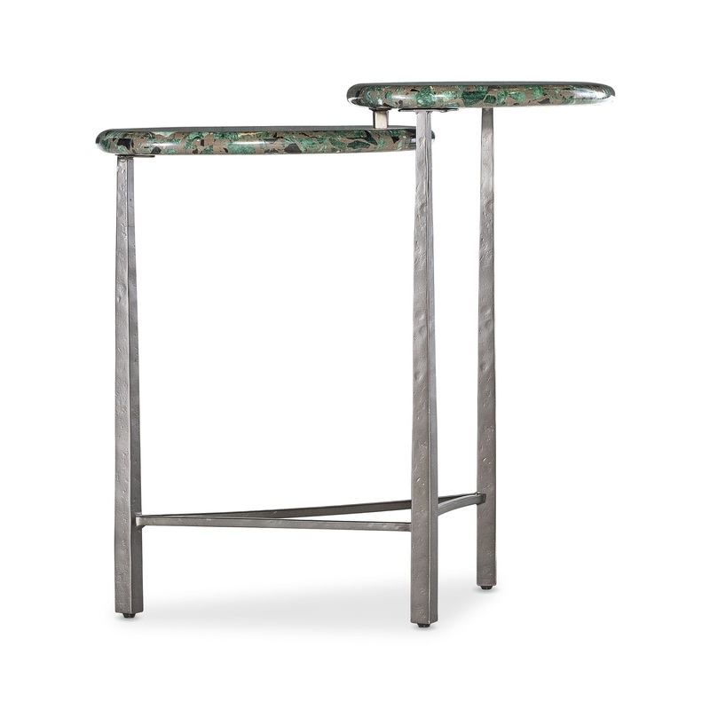 In a dynamic blend of shapes, materials and color, the Antares End Table is a stone-topped, two-tiered design. The textured metal base is complemented by soap stone tops with flecks of green, black and charcoal. 24-inches round.