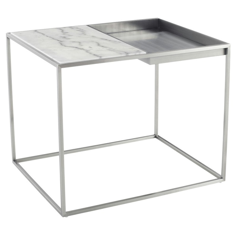 The Corbett side table employs minimalist design to great effect embracing mixed materials. A delicate frame crafted in polished steel supports a matching square basin connected to an inlaid solid marble surface. Contrast and functionality distinguish this smart geometric design. Each piece of marble is expertly crafted out of a unique piece of natural stone, creating beautiful variations and one-of-a-kind details.