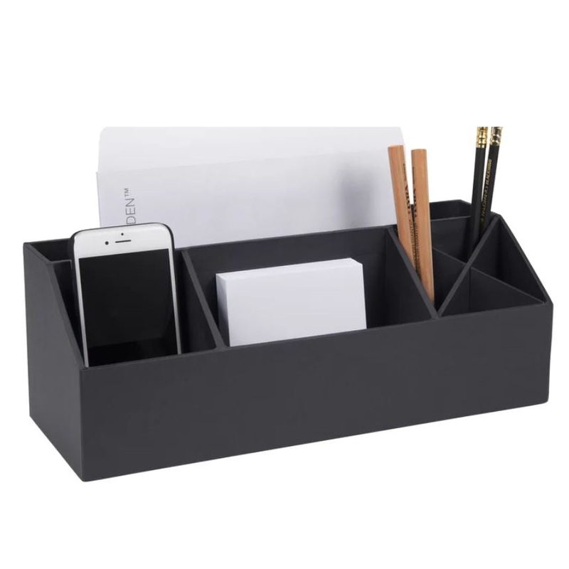 This desktop organizer with 7 compartments to help keep your desk uncluttered. There is a wide compartment in the back for placing notebooks, letters or folders. Collect your notes, pencils, small items, and mobile in the front to have it close at hand. Perfect for any area in the house where papers need to be kept in order and basic office supplies can be neatly stored.FeaturesAttractive and durable textured paper finishHand laminated construction process