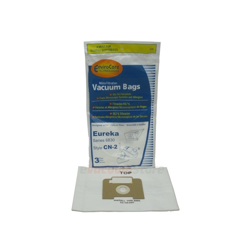 These generic Eureka CN-2 style dustbags are designed to fit Eureka GE and 6830 series vacuums. Specific models include 6830, 6831A, 6833A, 6833B, and 6833D. Each bag is designed to trap 99.7% of dirt, dust, and allergens that enter your vacuum cleaner.