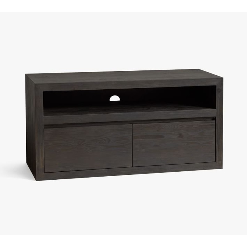 The simple, geometric construction of our Folsom Collection highlights the inherent beauty of the wood, where the visible grain and knots give this small media console its warm, individual character. An open shelf leaves space for curated decorating, while a cord cutout and drawers keep your tech devices and other items out of sight. Though scaled for smaller spaces, it can be paired in twos to create a long, low console of dramatic proportions. This collection is proudly made at a Fair Trade Certified factory.Console features large open shelf and 2 drawers for extra storage.Cord cut-out is located on back of console.Console drawers cannot be removed.Expertly crafted from solid pine wood, MDF and engineered wood.Available in oil-based Desert Pine or Charcoal finish.All sides are finished.Adjustable levelers provide stability on uneven surfaces.Made in a Fair Trade Certified factory, supporting fair and safe labor practices and empowering workers to invest in their communities. Workers receive extra funds for every product sold which are used for community projects chosen by workers.Imported.