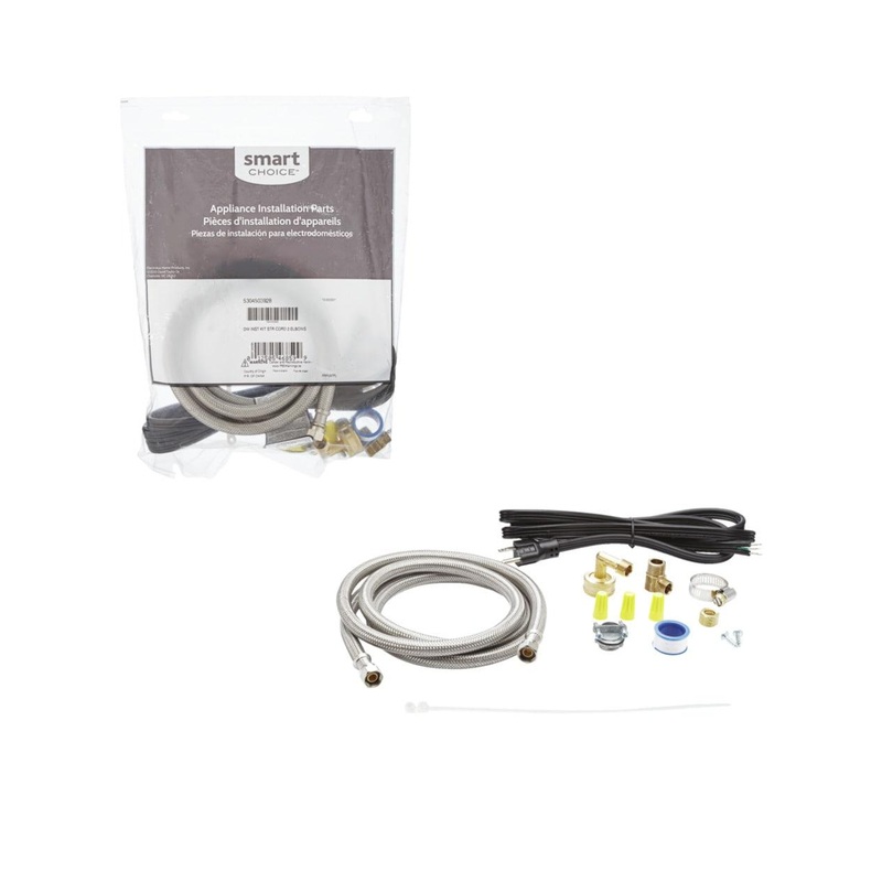 Get everything you need in one place to install your dishwasher and connect it to a water source with the Smart Choice Diswasher Installation Kit. The kit includes (4) countertop screws, teflon tape 1/2″ x 60″, 3/4″ dishwasher garden hose elbow, 3/8 lead free compliant elbow, (3) yellow medium Wire Nuts, 3/4″ knock out romex connector, 6′ Stainless Steel Dish Hose, 6′ Straight Electric Cord 105C, all stainless steel worm gear clamp, and zip tie-screw mount 10″.