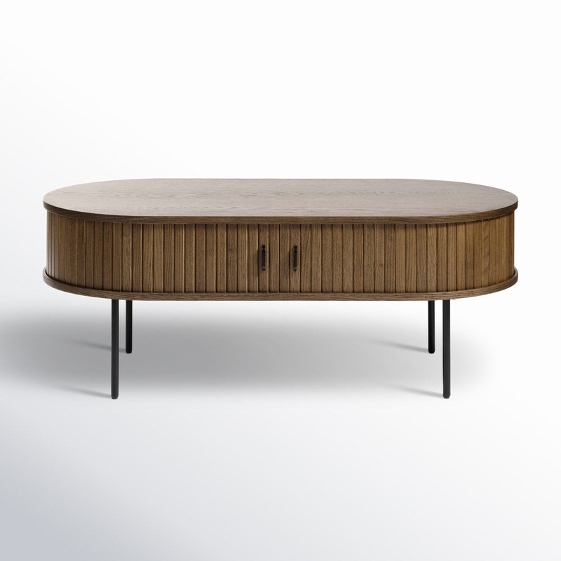 Shape + form. This coffee table seamlessly combines mid-century style with industrial elements, making it a versatile addition to your living room. The rectangular tabletop, crafted from solid and engineered wood, showcases an oak finish with natural grain variations. Sliding tambour doors offer an architectural touch plus, they open to reveal generous, secret storage compartments. We love that the wood has been kiln-dried, making it a reliable addition to your home. Pair it with the matching sideboard or TV cabinet for a cohesive look. AllModern Color: Smoked Oak