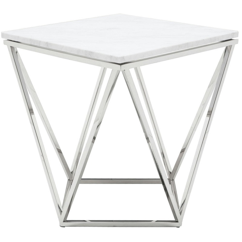 The Jasmine side table is notable both for its innovative design and structural grace. A solid marble tabletop rests on a delicate framework of squares and triangles in constructed polished stainless steel, inspiring a sense of lightness and refinement. Each piece of marble is expertly crafted out of a unique piece of natural stone, creating beautiful variations and one-of-a-kind details.