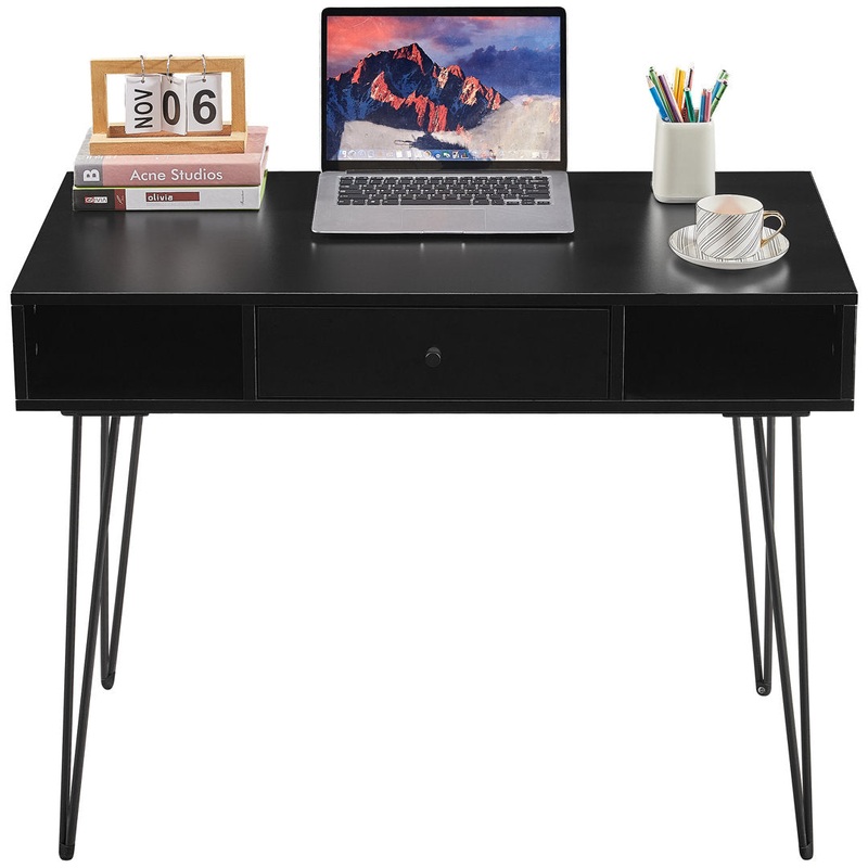 This writing desk gives you a spot to work and infuses a traditional industrial style into your home office or living room. It rests on top of four iron hairpin legs for plenty of support while the top section is made from engineered wood, with a rich maple finish that adds a more natural look to your space. A central drawer with metal glides and two open shelves on either end allow you to store all your office supplies in one place. Trent Austin Design Color: Black