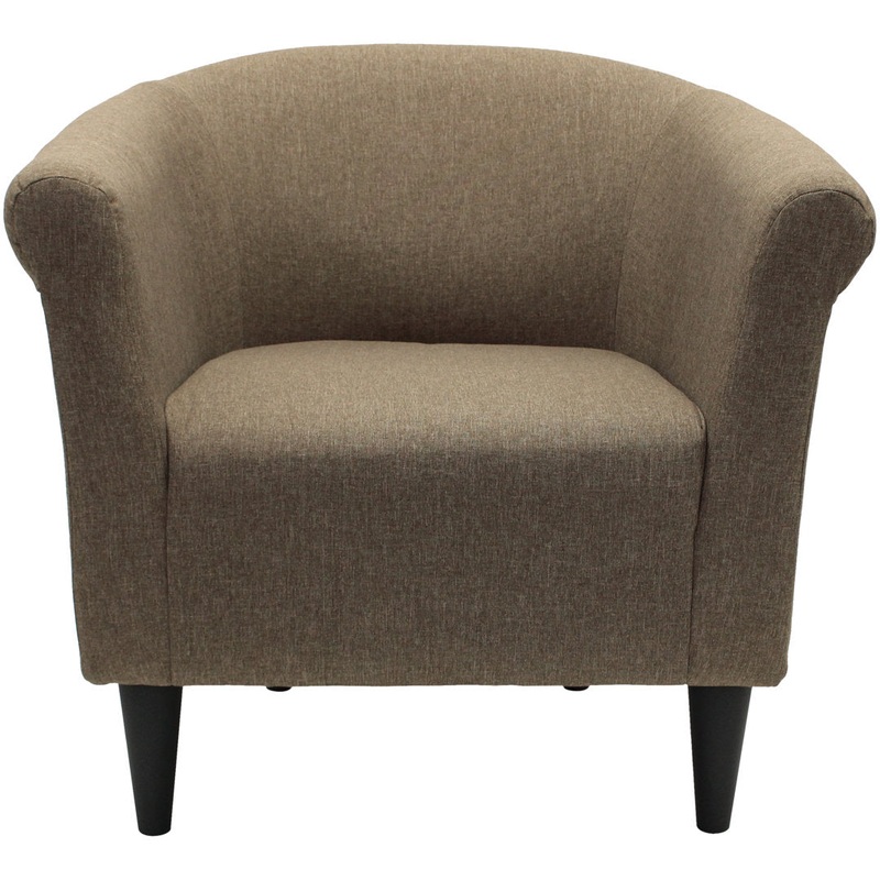 A traditional design gets a contemporary update in this streamlined barrel chair. Founded on an engineered wood frame, this barrel chair features a curved back, rolled arms, and plastic round tapered legs. Enveloped in easy-to-clean faux leather upholstery, this chairs high-density foam cushioning provides comfort and support. Zipcode Design Fabric OR Leather Type: Pecan Microsuede