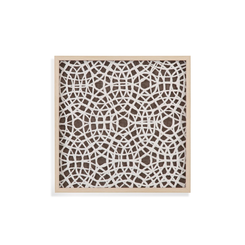 Lined Wall Art is a shadow box accentuated with a rice paper-like brown mat and a circular radiating pattern of woven white rattan with a natural blonde molding.Product FeaturesThis piece of art is hand painted by a skilled artist making each piece uniqueN