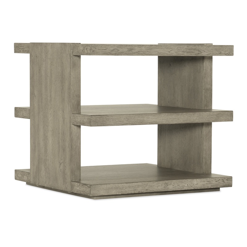Organic and rustic with a modern silhouette, the Overlook Trails End Table has two open spaces, one fixed shelf and a plinth base. Crafted of Oak Veneers, the table is finish in Mink, a soft smoked gray.