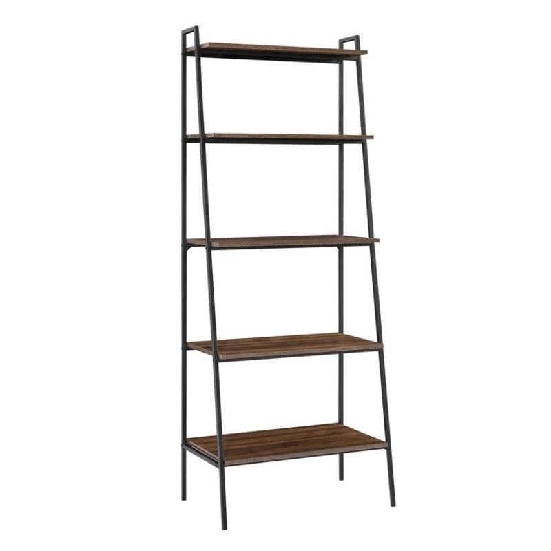 Light industrial. With its compact size and open construction, this ladder bookcase is ideal for styling smaller spaces. The open frame is made from a blend of metal and engineered wood for a mix of materials, and it rests on angled, A-shaped legs. We love how the weathered hue and matte black finish lend this piece some vintage-inspired appeal. This bookcase comes with four tiered shelves to display plants, ceramics, and, yes, even books. Plus, it includes all-mounting hardware for added safety in your living room or home office.FeaturesWith a metal frame and durable laminate constructionIdeal for any room, from your living room to your bedroomIncludes wall anchor for stabilityWith five shelves for maximum storage or to decorateIn a blend of urban industrial and Mid-century modern design styleShips ready-to-assemble with step-by-step instructions