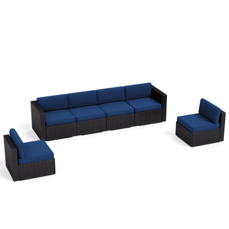 Enjoy warm days and breezy evenings with this wicker patio sectional. This outdoor set seats five and includes 12 removable cushions. Its reinforced-rattan base in a tight, dark wicker weave adds texture, making this patio furniture ideal for coastal patios and poolside retreats. We love that its cushions are upholstered in water- and weather-resistant polyester blend and have removable covers for easy cleaning. Plus, this sofa is modular, so you can orient each seat in a layout that best suits your space. Lark Manor