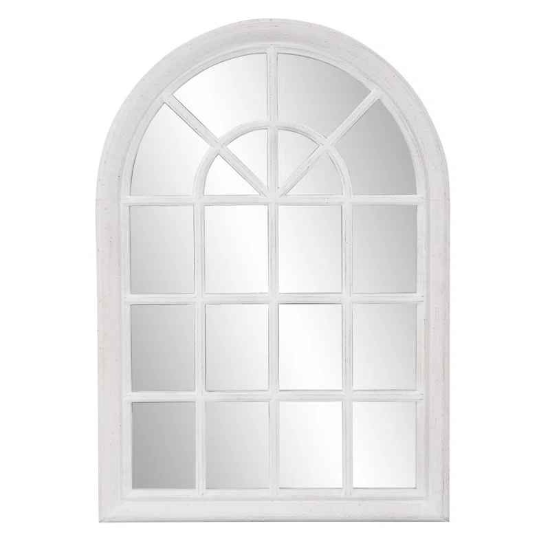 This mirror resembles an arched window, complete with sectioned window panes. The wood frame is finished in a distressed white finish making it perfectly fit into your shabby elegance or Cottage-Esque decor.FeaturesArched Panel Window DesignWhite Washed Wood FrameIt is a perfect focal point for an entryway, bathroom, bedroom, or any room in your home.No Beveling on GlassThe mirror is ready to hang right out of the box.41 in. by 29 in. Dimensions