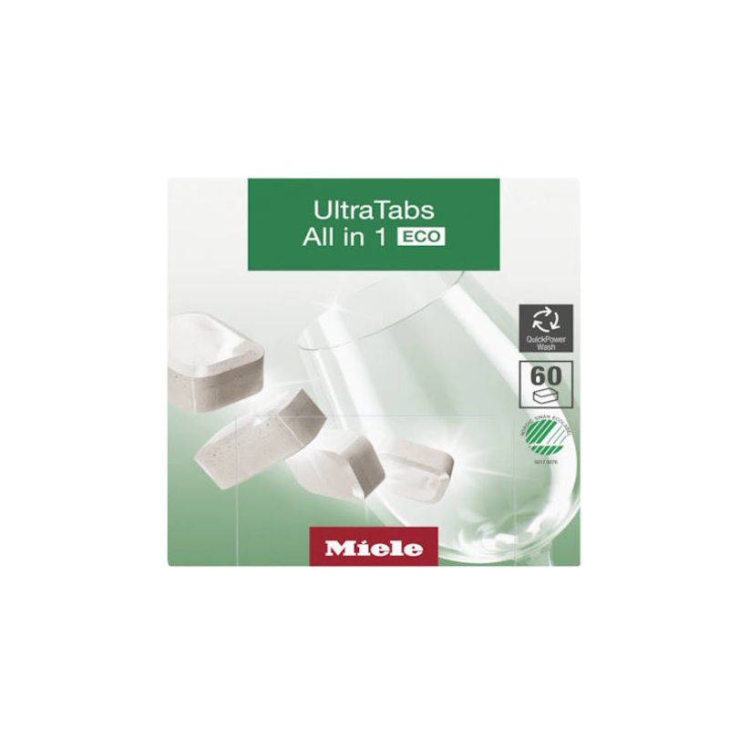 The MIele UltraTabs All in 1 ECO are designed for excellent cleaning results and eco-friendliness with sparkling results even at low temperatures. Excellent environmental performance verified by Nordic Swan using a water-soluble and biodegradable wrapping and is fragrance-free with no colorants or preservatives and microplastics.