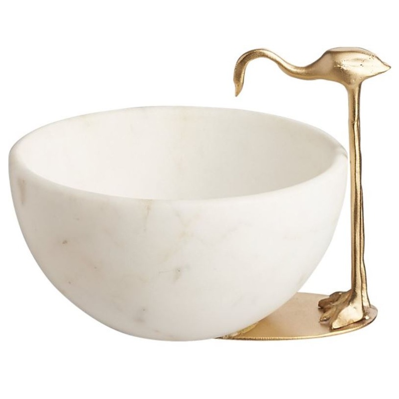 BIRD FEEDER. Meet Miles. The long-legged recycled brass bird stands tall over hand carved white marble bowl. Beautifully finished with just the right amount of quirk. Perfect for dips, snacks and show. CB2 exclusive.