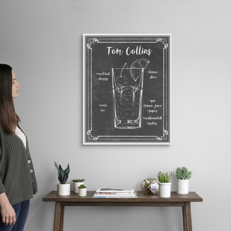 Blueprint style diagram and recipe of a Tom Collins cocktail. The solid-faced canvas is certified museum-grade and designed to withstand the test of time. Durability, image clarity, and color accuracy are the top priorities. Archival inks are used to prevent fading and preserve as much fine detail as possible with no over-saturation or color shifting. Featuring a proprietary design, this canvas produces the tightest corners without any bubbles, ripples, or bumps, and will not warp or sag over time. Additionally, it includes a finished backing with pre-installed hanging hardware that adds an extra level of design. This giclee wall art is sure to become the focal piece of your living room, family room, great room, bedroom, bathroom, office, kitchen, dining room, game room, bar, or more. 17 Stories Size: 31.7″ H x 25.7″ W x 1.75″ D, Format: White Floater Frame