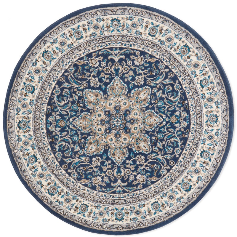 Elevate your living room, bedroom, or home office with the classic style of this oriental rug. It features a traditional style, with a central floral medallion surrounded by botanical motifs, all rendered in shades of ivory and beige on a vibrant navy blue background. This rug is power loomed in Turkey and is constructed of polypropylene with a jute backing and a medium pile height. We recommend a rug pad for additional comfort and stability. Andover Mills Rug Size: Round 5’2″
