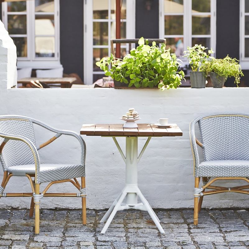 The Nicole Square Caf Table by Sika Design delivers the right blend of style and sophistication for your exterior seating. The broad surface features reclaimed teak wood, giving the table strong rustic undertones while still presenting some modern geometric flair. The supporting frame is made of aluminum, with thin stabilizing legs extending out from a thick central beam. Made to withstand the elements without losing its appeal, the Nicole Caf Table makes an excellent addition to a patio or veranda.