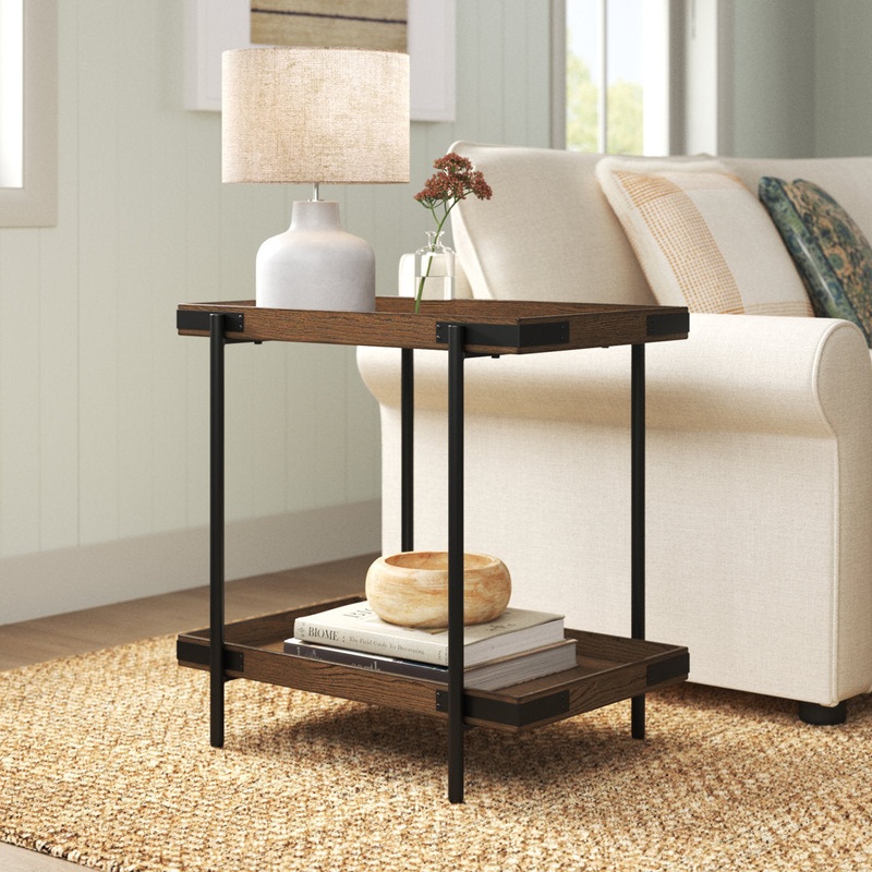 This end table centers your living room or den with a rustic and industrial-inspired style. It features two tray tops crafted from solid oak wood with a weathered finish and natural wood grain for tons of coastal farmhouse charm. The open black metal base features four thin legs that hold up the trays, and they’re all attached to brackets with raised hardware. This rectangular end table also has raised sides that prevent books, accent pieces, and indoor plants from tipping over. Best of all, this table includes all the tools you need for fuss-free assembly. Trent Austin Design