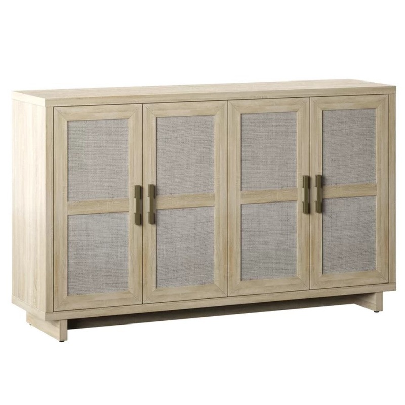This versatile credenza features a spacious design that’s just right as a buffet in your dining room or a TV stand in the living room. The clean-lined frame is made from solid and engineered wood with a weathered finish that complements your coastal farmhouse decor. Two sets of double cabinet doors feature linen panels for a breezy look and feel, while adjustable shelf space behind them accommodates dishes, media items, and towels. We love how the gold metal handles add textural contrast to the finish. Plus, this credenza has a wide surface for appetizer trays and a table lamp.FeaturesCabinet doors feature linen panels for a touch of shoreline styleEuro hinges are hidden when doors are closed for a sleek, no-show lookLeveling feet make it easy to achieve stable placement on uneven surfaces