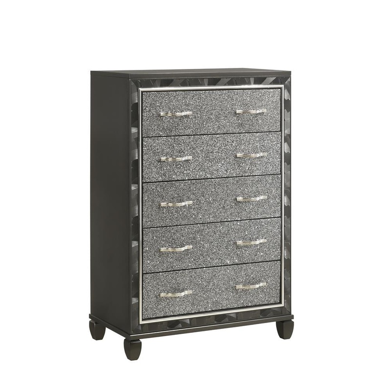 The Radiance Bedroom Collection is a mesmerizing blend of modern elegance and glamorous charm. Crafted with solid wood and MDF, this collection ensures durability and stability. The striking silver finish adds a touch of sophistication to each piece. The headboard, made of 80% faux leather and 10% cotton, creates a luxurious focal point in the room. The brushed steel face framing and glittered drawer fronts add a dazzling allure. The chrome pulls with rhinestone inlays exude opulence and style. The felt-lined top drawers provide a soft surface for delicate items, while the finished drawer interiors showcase meticulous attention to detail. The English dovetail construction and full extension ball-bearing glides ensure smooth and reliable operation. The crystal tufted, lighted headboard and mirror add a radiant ambiance to your space. With the Radiance Bedroom Collection, elevate your bedroom to new heights of elegance and glamour.