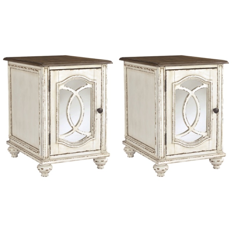 Elevating the art of traditional cottage styling, this 2-piece chairside end table set is sure to serve you beautifully for years to come. Antiqued two-tone aesthetic blends a chipped white with a distressed wood finished top for added charm. Cabinet door features inset mirror with filigree moulding for a fanciful twist.