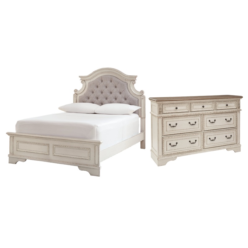- Includes bed (with upholstered headboard, footboard and rails) and dresser